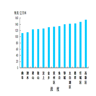 可吸入颗粒物浓度最好的县(市、区)是曲阜市,为112微克/立方米;最差的县(市、区)是高新区,为155微克/立方米;同比改善幅度最大的县(市、区)是鱼台县,为34.1%,同比改善幅度最小的县(市、区)是任城区,为0.7%。