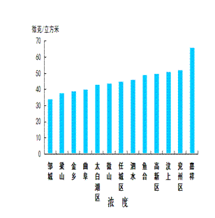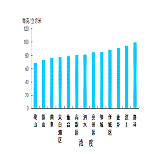 细颗粒物浓度最好的县(市、区)是梁山县,为69微克/立方米;最差的县(市、区)是嘉祥县,为100微克/立方米;同比改善幅度最大的县(市、区)是鱼台县,为40.6%,同比改善幅度最小的县(市、区)是金乡县,为8.9%。