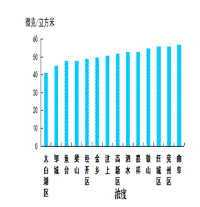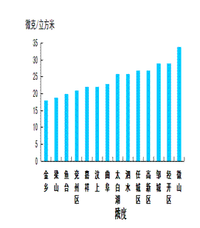二氧化氮浓度最好的县(市、区)是太白湖区,为41微克/立方米;最差的是曲阜市,为57微克/立方米;同比改善幅度最大的县(市、区)是嘉祥县,为23.2%,同比恶化幅度最大的县(市、区)是金乡县,为42.9%。