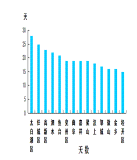 优良天最多的县(市、区)是太白湖区,为28天;最少的县(市、区)是经开区,为15天;7县(市、区)同比改善,改善幅度最大的县(市、区)是太白湖区,为20.0个百分点;6县(市、区)同比恶化,恶化幅度最大的县(市、区)是微山县和金乡县,均为20.0个百分点。